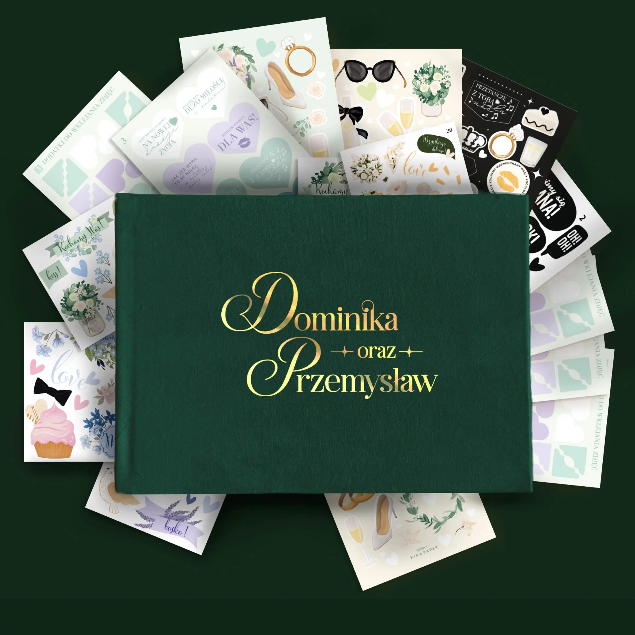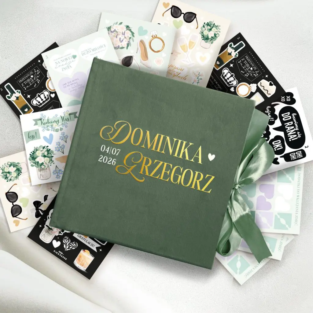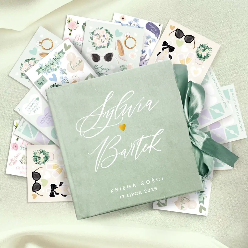 Welurowa księga gości PISTACJA do wyboru z ankietami + zestaw naklejek
