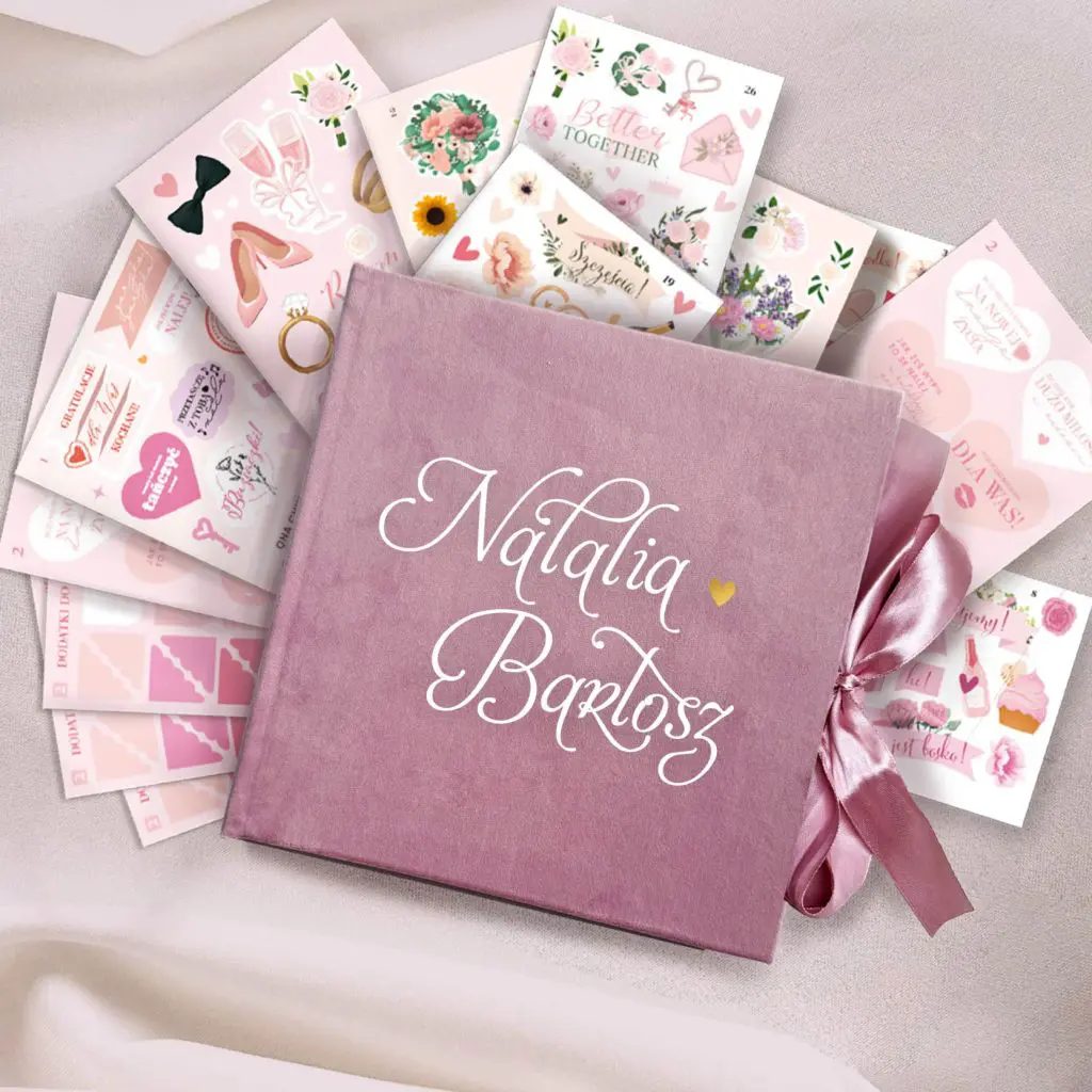 Welurowa księga gości RÓŻOWA do wyboru z ankietami + zestaw naklejek