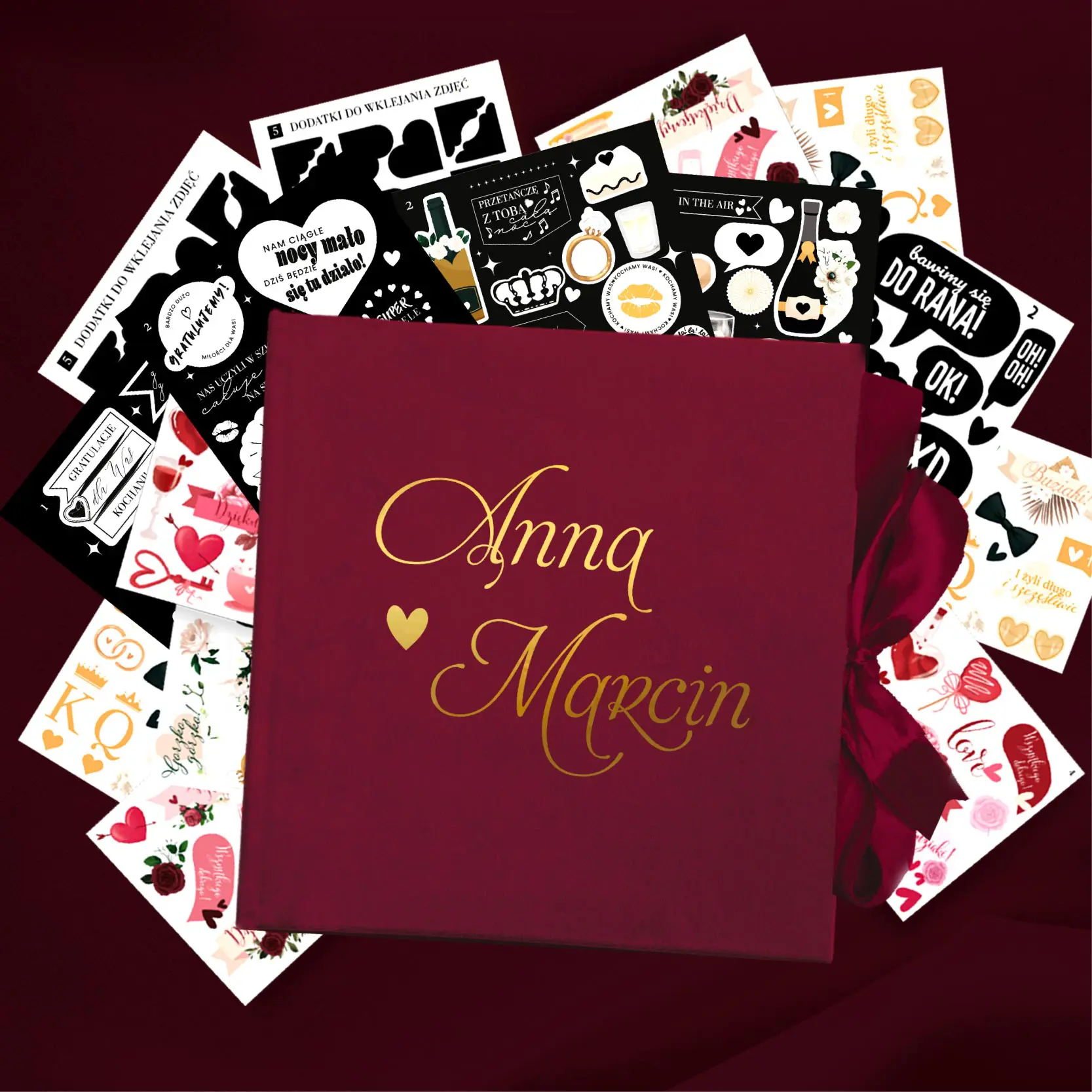 Welurowa kwadratowa księga gości z wstążką BORDO + zestaw naklejek