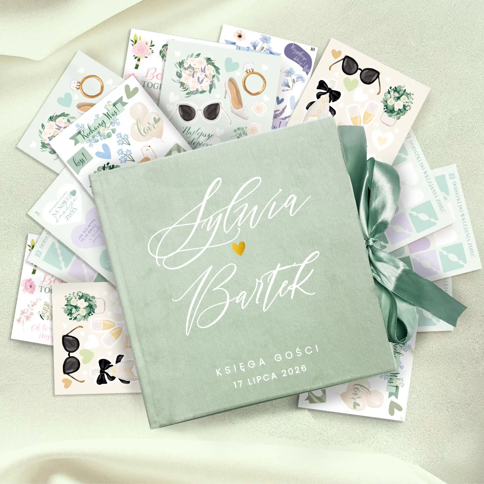 Welurowa kwadratowa księga gości z wstążką PISTACJA + zestaw naklejek