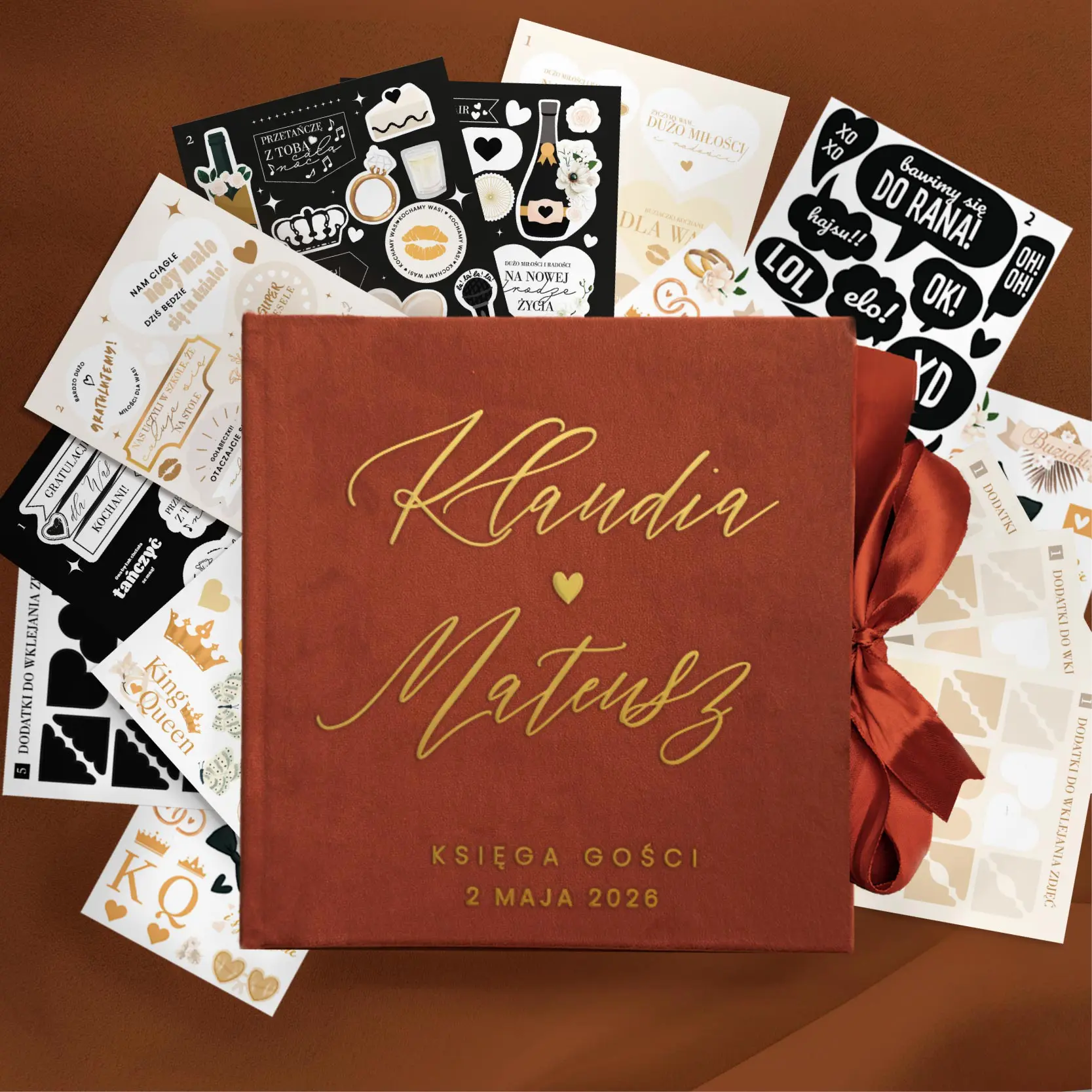 Welurowa księga gości LATTE do wyboru z ankietami + zestaw naklejek