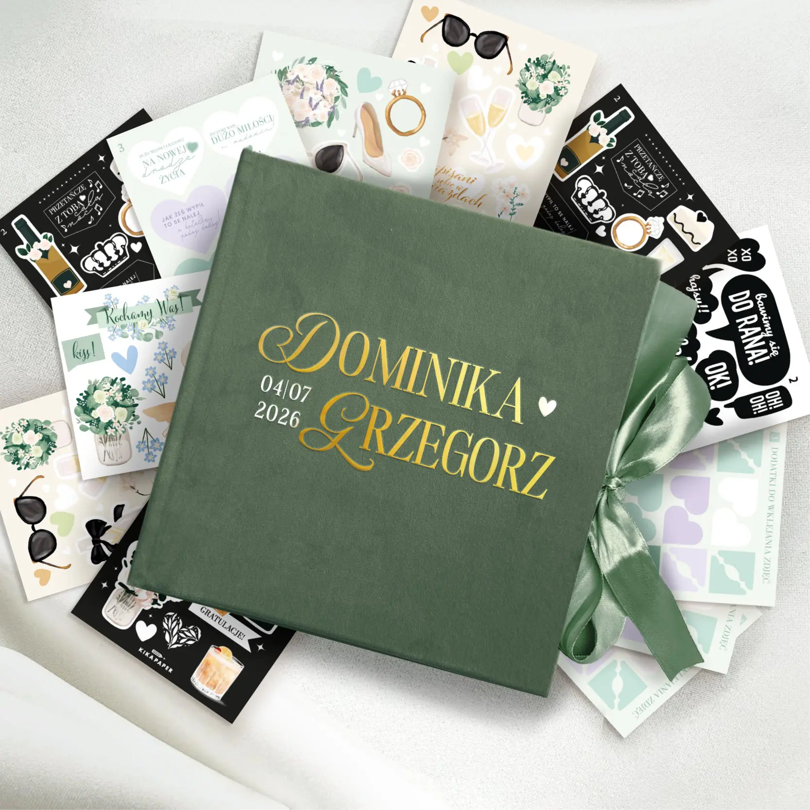 Welurowa kwadratowa księga gości z wstążką OLIWKOWA + zestaw naklejek
