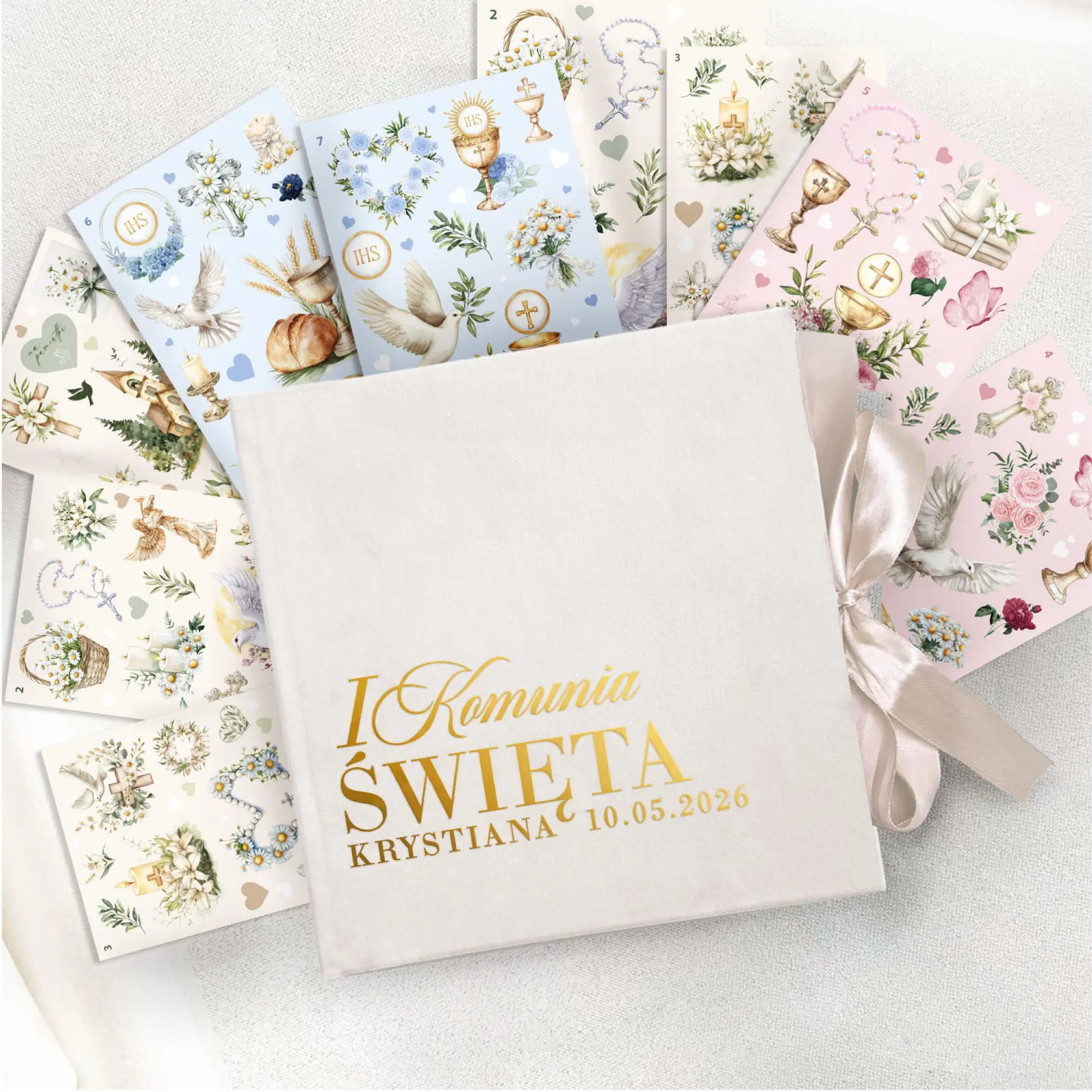 Welurowa księga gości NA KOMUNIĘ 16 kolorów + zestaw naklejek