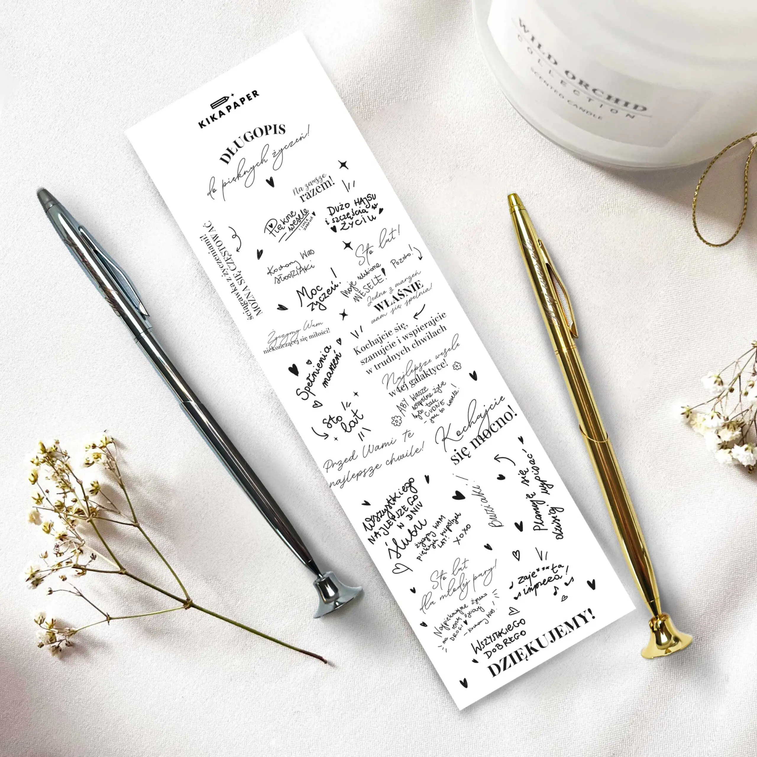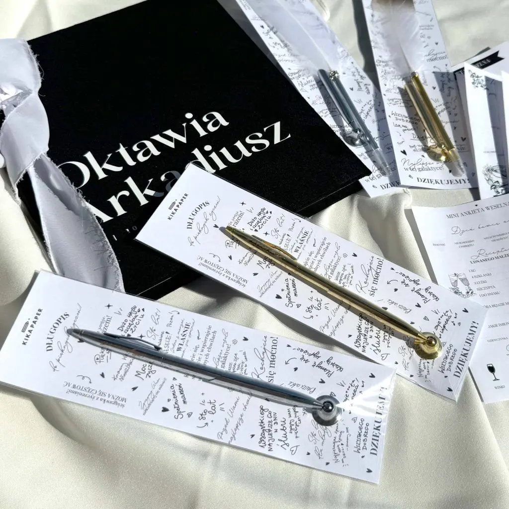 Aby ułatwić gościom wyrażenie swoich serdecznych słów, do długopisu dołączona jest karteczka z przykładowymi życzeniami, które mogą zainspirować tych, którzy nie wiedzą, co napisać. To nie tylko praktyczny, ale również wyjątkowy element, który zostanie pamiątką tego szczególnego dnia przez długie lata.